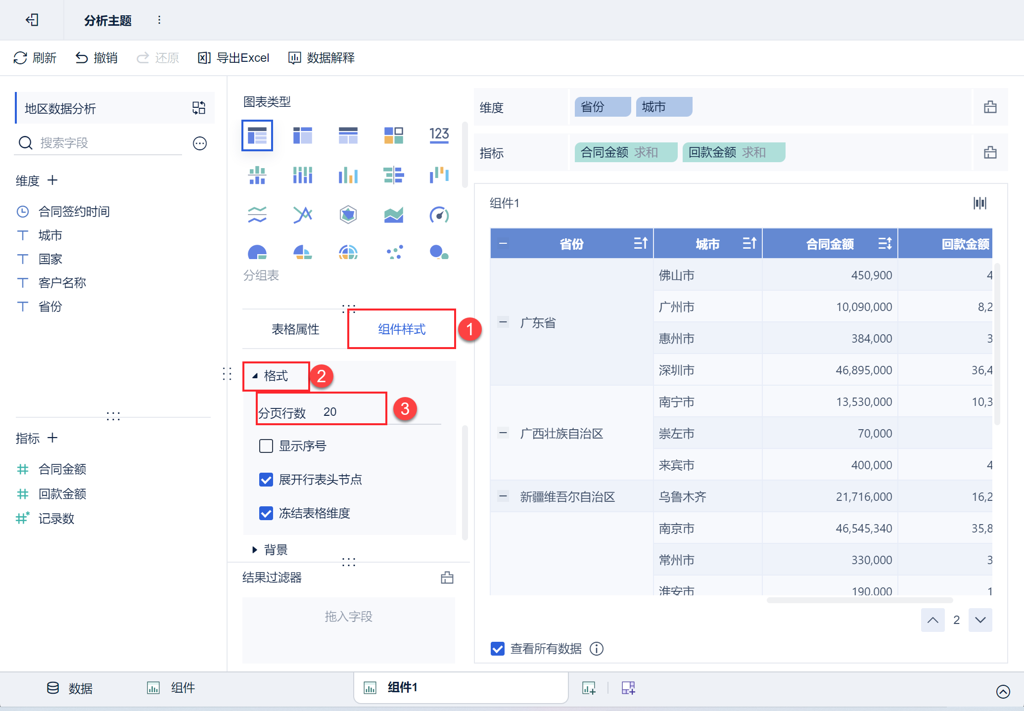 A:进入组件编辑界面,在「组件样式>格式」中的「分页行数」或者「分页列数」中输入需要设置的行列数即可,如下图所示: