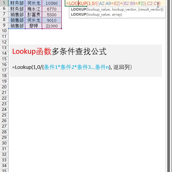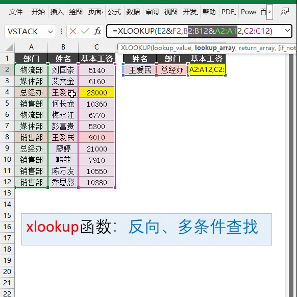 ·下面我们再看一下 look up,如果说在老的班主任不能用 black 他,一般用look up来完成多条件查找。咱们看这个例子。现在我想根据部门和姓名来查找他这边公司。