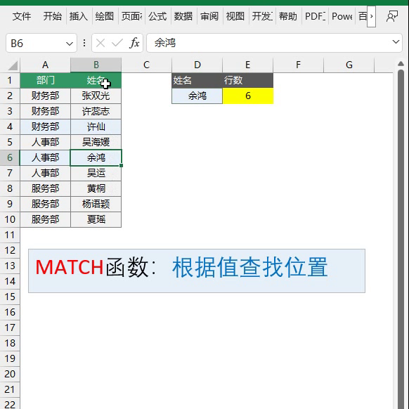 ·第三个是麦吉函数,麦吉函数可以根据词查找它的位置。比如现在我看指定的有一列姓名,现在我要查找一下于洪,那么它在这一列是第几行?可以用脉去函数查找,等于查找第二,然后在b列查找,那零表示精确匹配。查到结果就是第六行,一、二、三、四、五、六,第六行。这是match函数的用法。那么s思路卡普,这是o v三六五新增了一个函数,它可以进行反向和多条件查找。