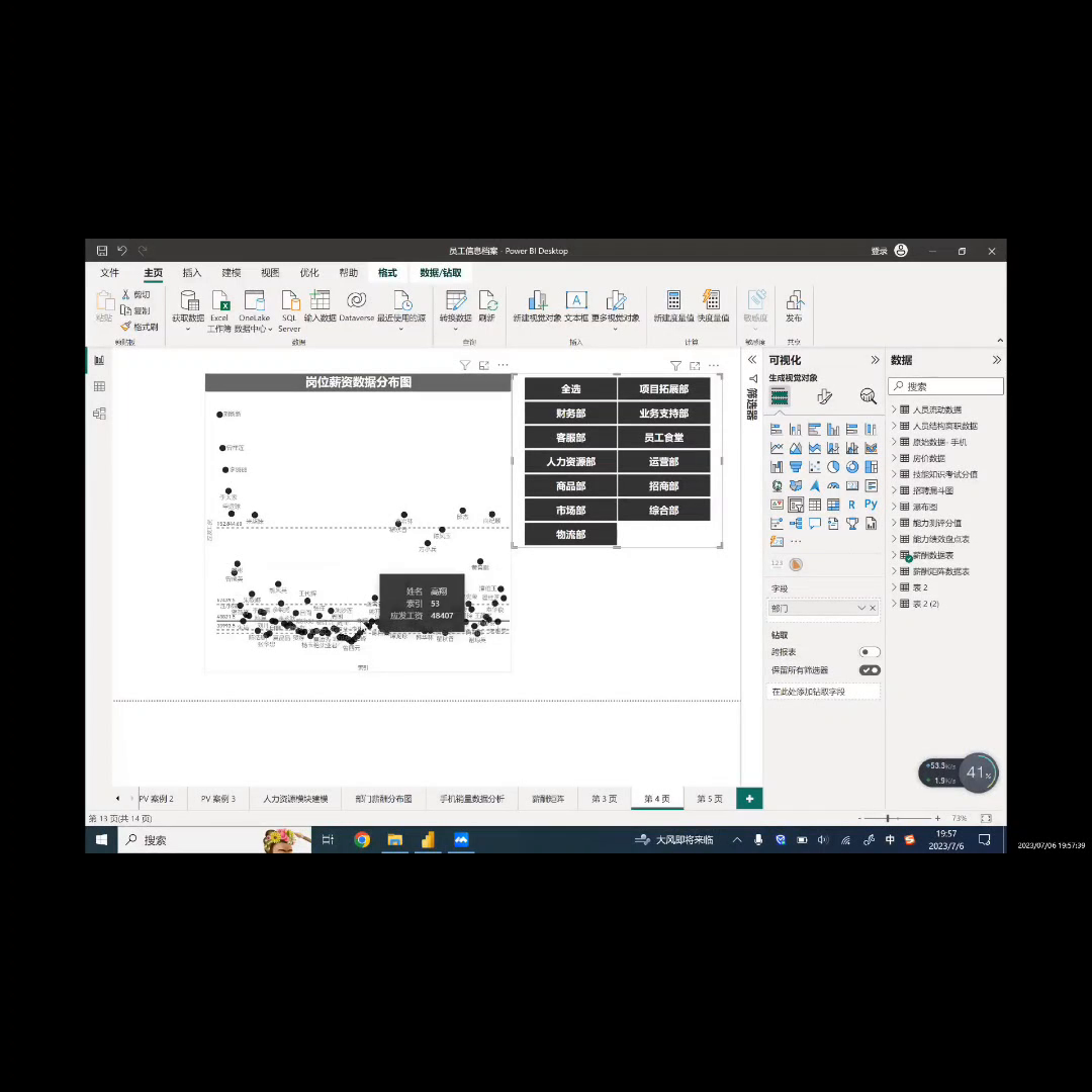 但在这个模型的应用中,还是要根据我一切片机的部门来做。也就是说当我选择不同部门的时候,就会显示每一个部门内部的这些岗位员工跟市场数据对标,他的竞争力是哪子?比如我选择人力资源部。选一下,选人力资源部。