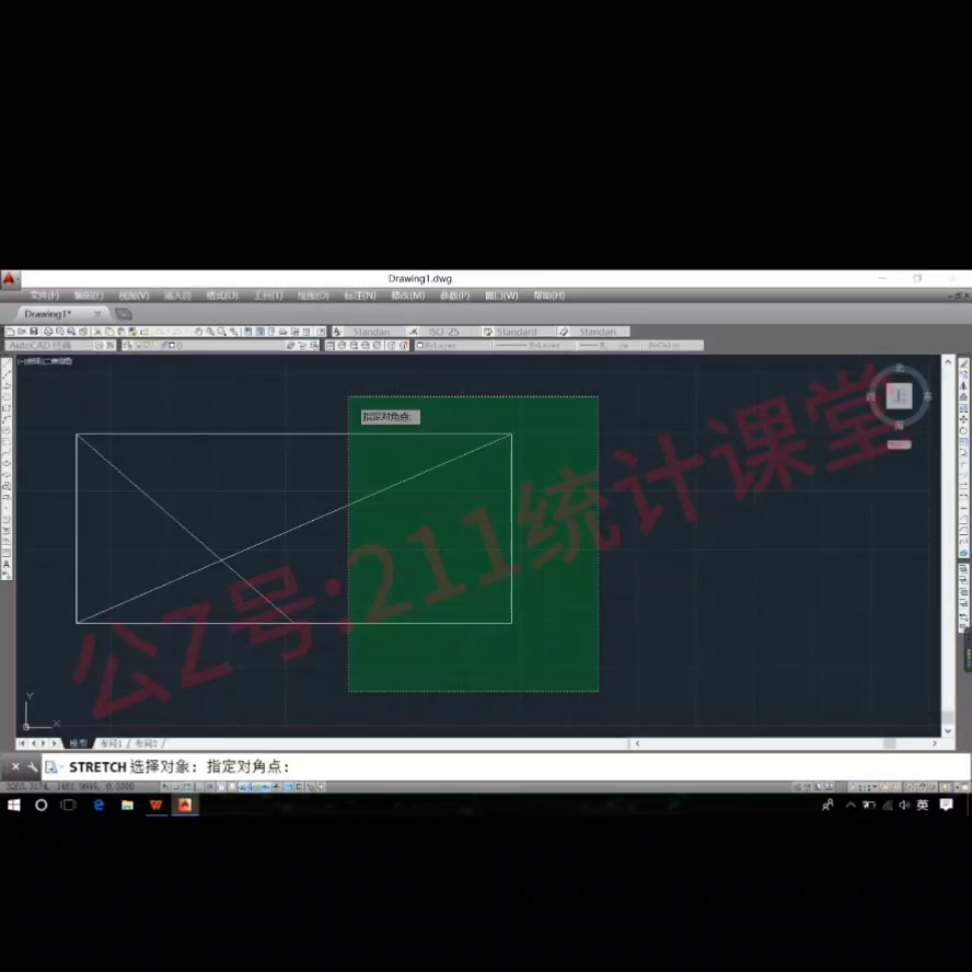 ·刚刚学习了拉伸的快捷键是s,输入s点击回车,它让我选择对象。这是个时候选择对象,通常用触选也就是从右到左,这样用绿色的界面将其选中。因为触选是一旦碰到了一条线的某一个部分,这一条线就会被选择,所以用触选尽量选择更多的线进行拉伸。