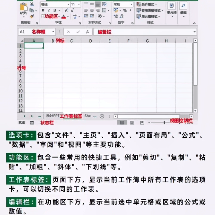 Excel的主要功能分为选项卡和功能区两部分。选项卡包含“文件”、“主页”、“插入”、“页面布局”、“公式”、“数据”、“审阅”和“视图”等主要功能;功能区则包含一些常用的快捷工具,例如“剪切”、“复制”、“粘贴”、“加粗”、“斜体”、“下划线”等。