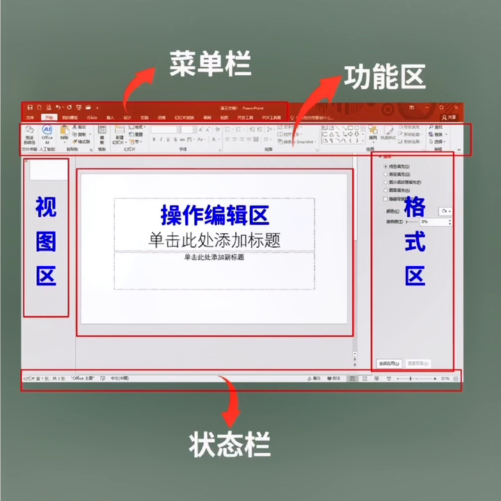 工作区位于中央区域,是演示文稿的工作区域。用户可以在编辑区输入文字、插入图片、绘制图形等。编辑区的大小可以在右下角进行调整。