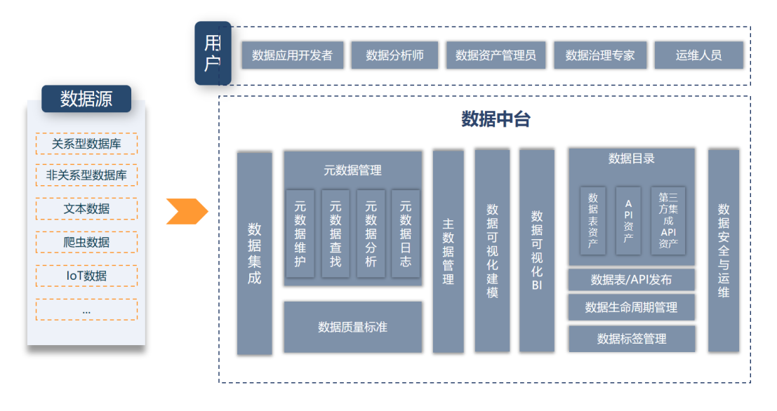 我们的数据中台平台主要由数据集成、元数据管理、数据质量标准、主数据管理、数据可视化建模、数据可视化BI、数据资产管理和数据安全与运维8部分组成。