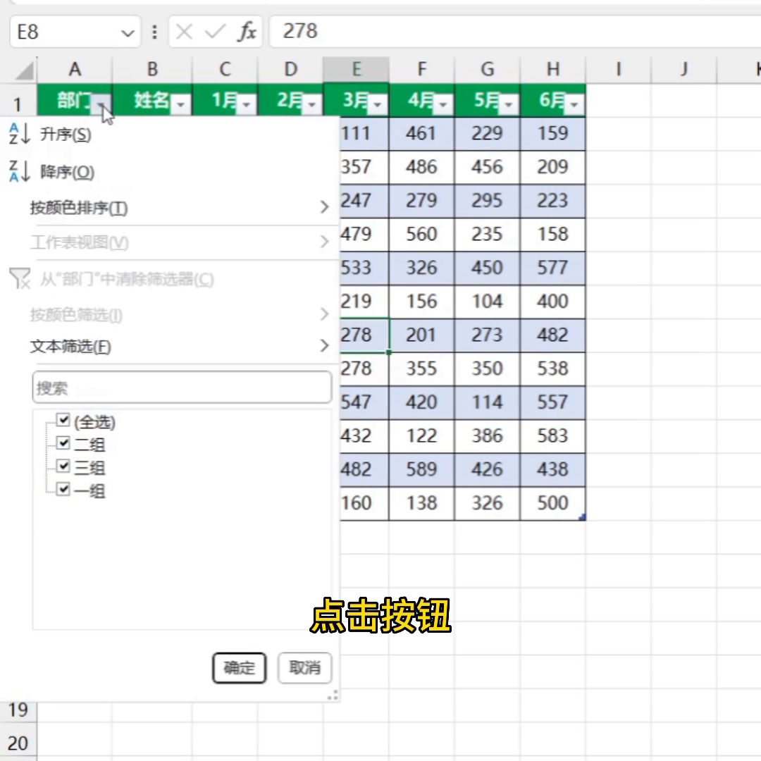 ·第六个功能是切片器功能。同样,先点击超级表格,然后点击表设计,勾选插入切片器,勾选部门,点击确定。这样就生成了一个切片器,点击部门名称,对应的所有数据就全部筛选出来了。