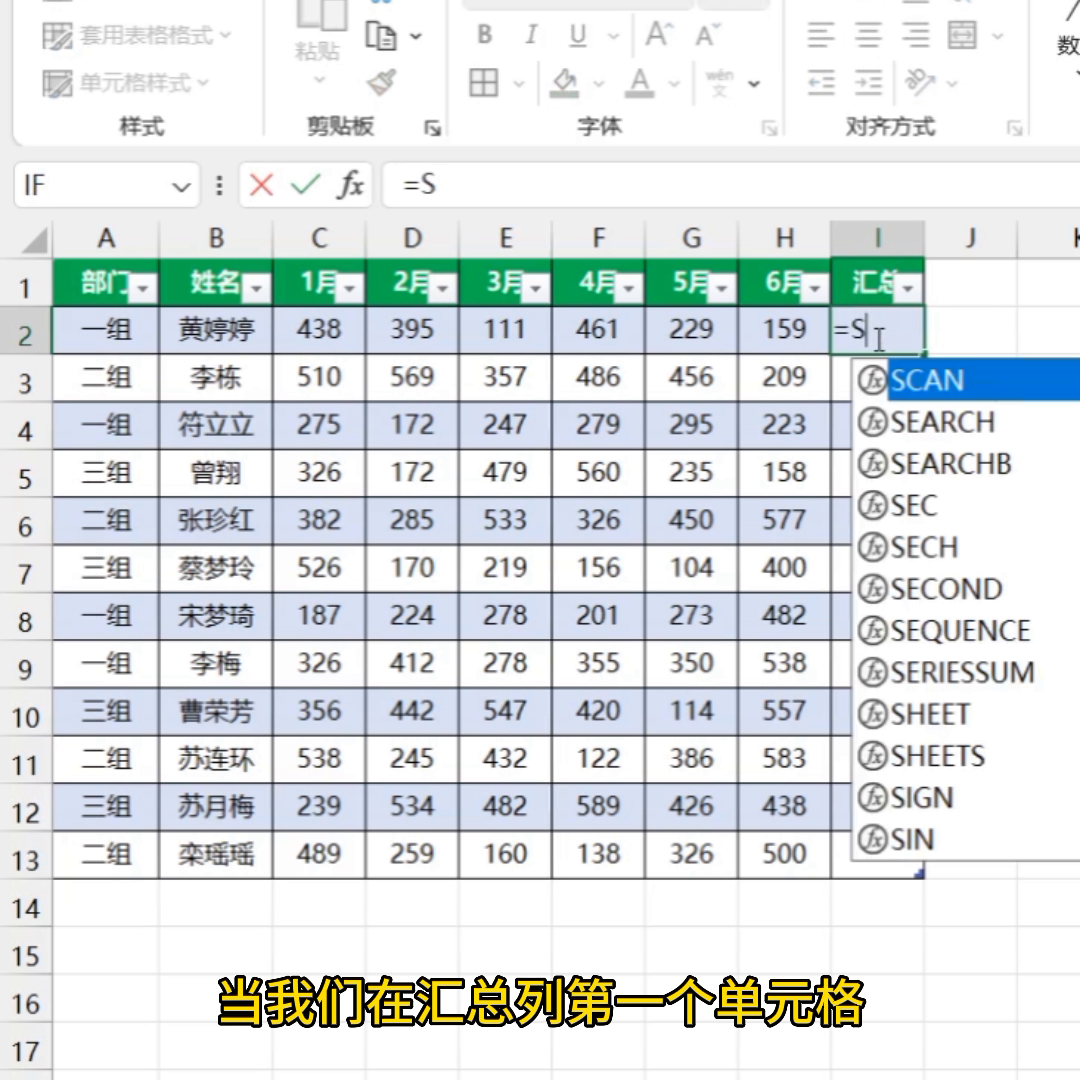 ·第三个功能是自动填充函数或公式。在汇总列第一个单元格输入sum函数,输入计算公式后,回车确定。这样,下方所有单元格都会自动填充公式。