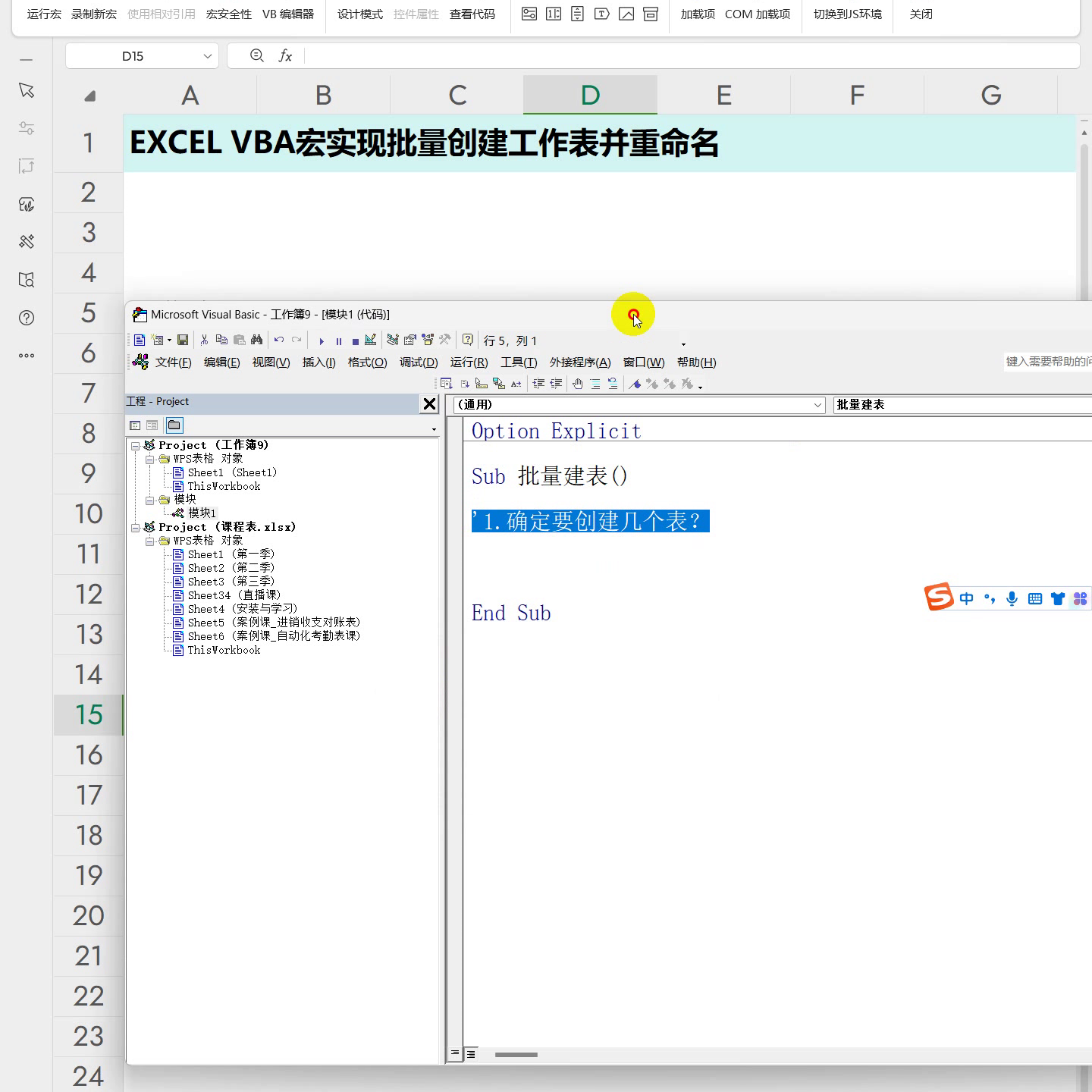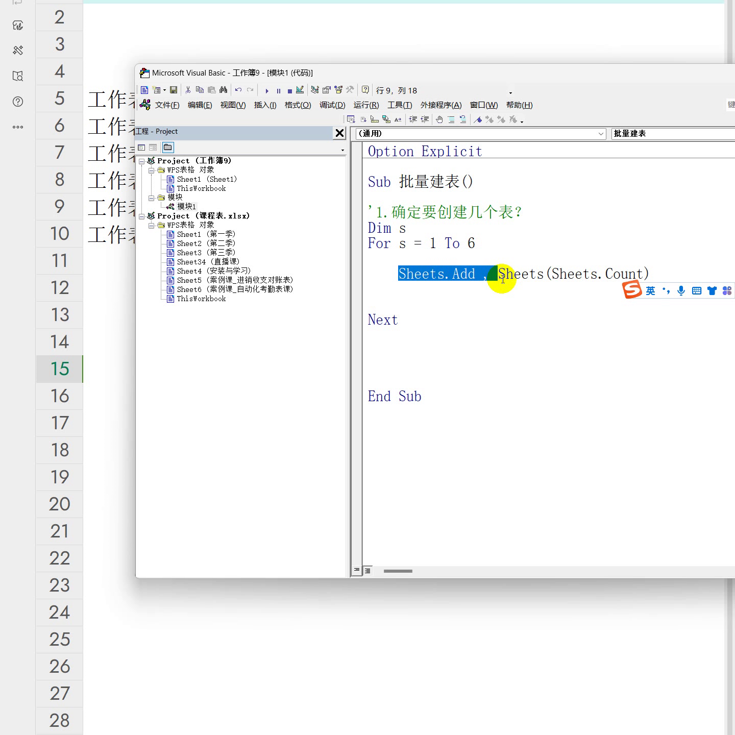 大家好,今天我来分享一个经典的Excel案例,如何批量创建工作表并进行重命名。首先,打开开发工具,然后点击“插入”,再点击“模块”,在其中写下“批、线、表”三个字,分别代表“项目”、“流程”和“表格”三个方面。接着,写一个循环,每次循环创建六个工作表,命名为“s”,其中的s代表“表”。