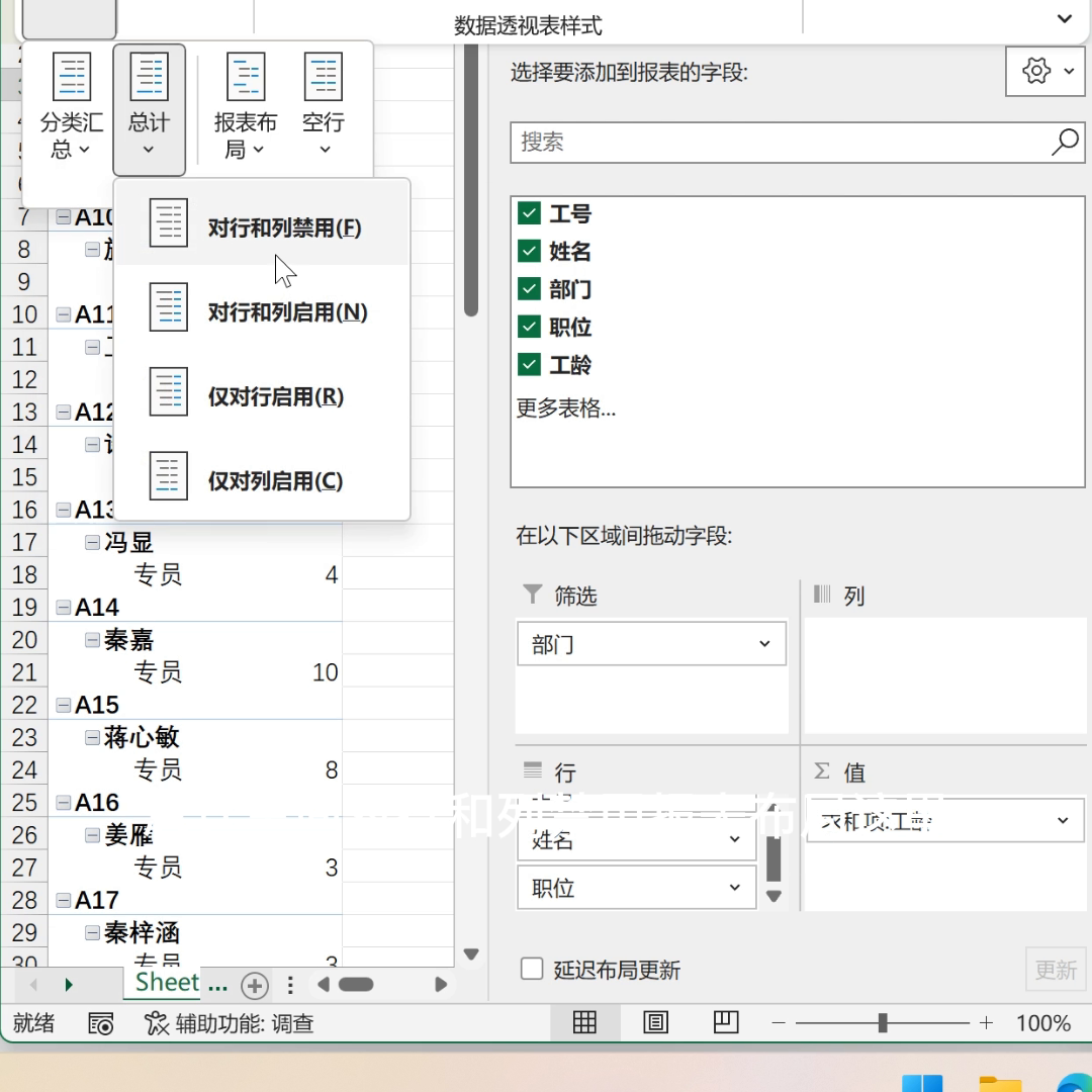 在工具栏的右侧有一个“设计”选项,可以在这里调整格式。在“布局”选项中,选择“分类汇总”,然后选择“不显示分类汇总”和“显示报表筛选页”。