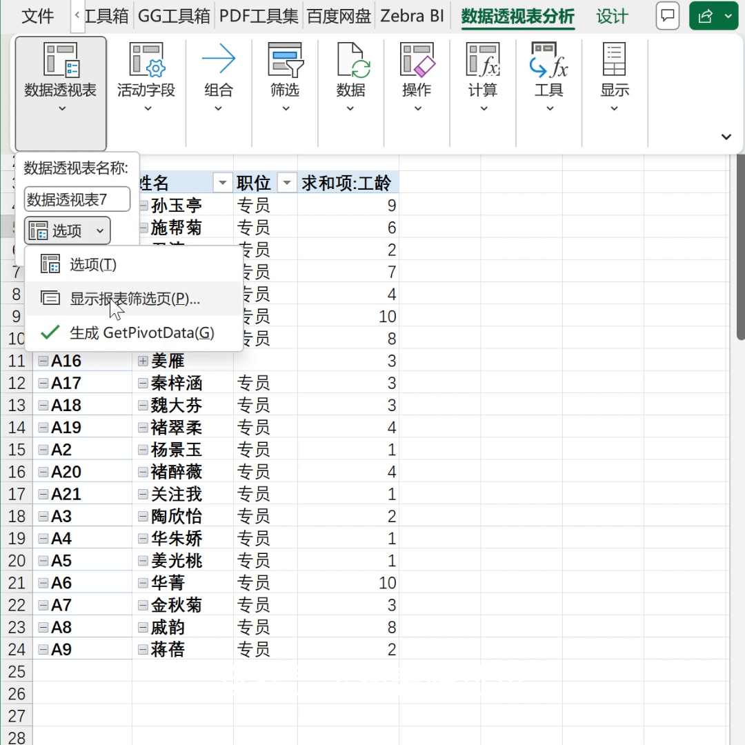 最后,可以为数据透视表命名,并使用“数据透视表”选项卡进行分析。点击“数据透视表”选项卡,选择“显示报表筛选页”。