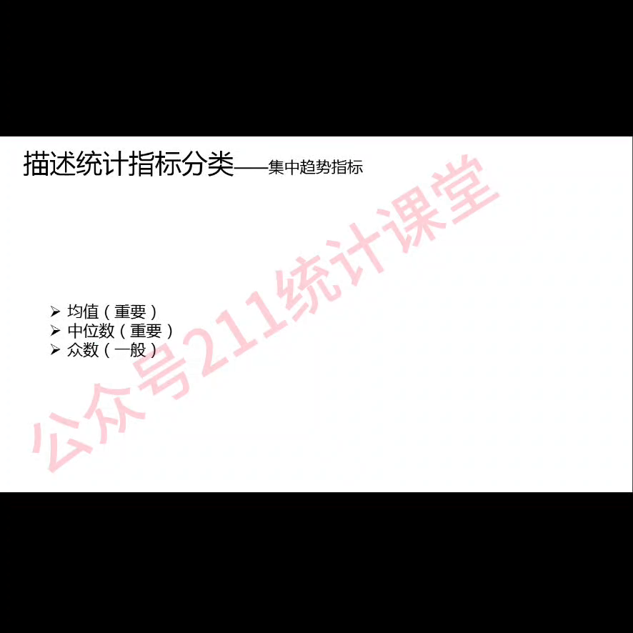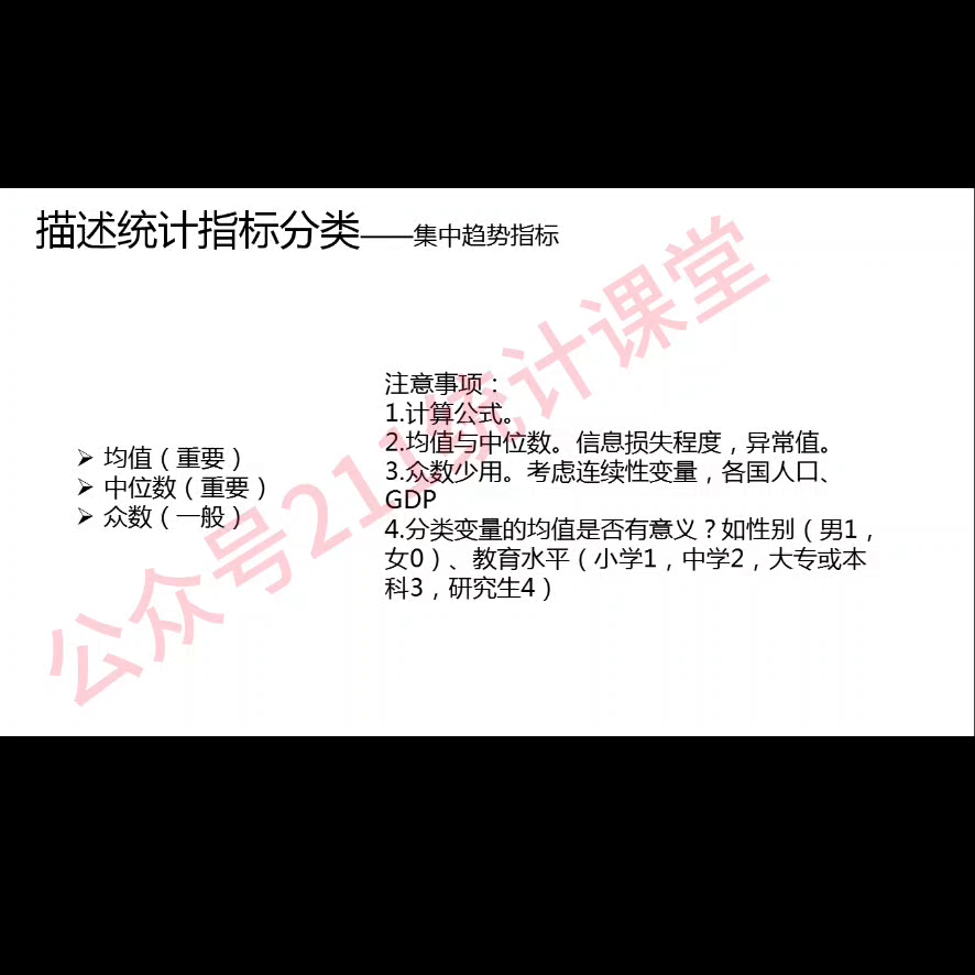 下面就给大家介绍一下描述统计的一些指标分类,那么它主要是分成两类,一类是表示指标中趋势的,有均值,中位数纵数,它都表示集中趋势的。前面两个均值和中位数是比较重要的,一般在时政分析里面都要报告均值和中位数,但是中数就用的比较少。