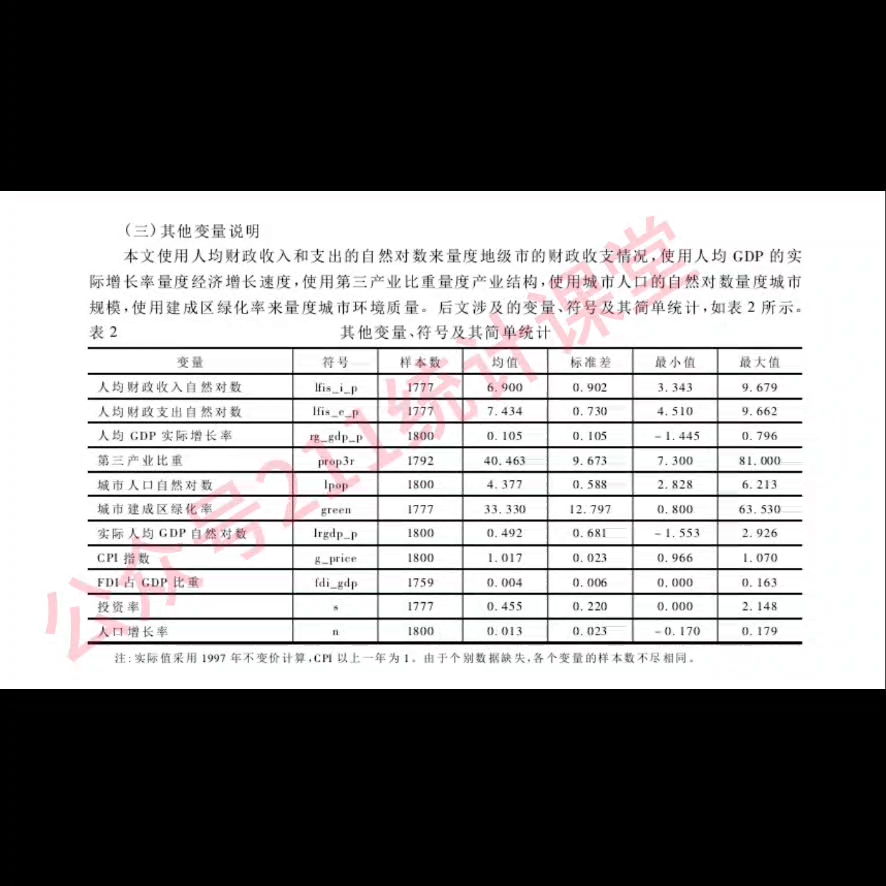 当然了,在时政分析里面要把它纳入到模型里面的全部的变量,都要做一个描述统计的表格。也就是说不仅要对核心的解释变量,要把它列出来,也要把控制、容量也要把它列出来。比方说这里其他变量说明就包括在模型里面涉及到的一些控制变量等等的一些数据情况,也是格式也是类似量的含义符号。后面就是样本容量、阈值、标准差、最小值最大块值,后面表格就从符号开始这一列,往后的都可以用state直接就能够把它导出到excel里面,然后把它复制到文档里面就可以了,可以直接的使用的,只是做一只需要做一些简单的处理。