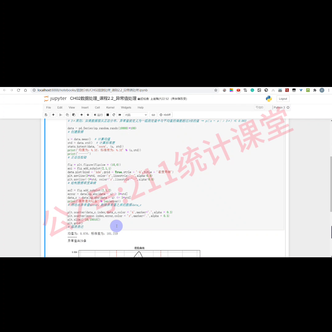 异常值就是指样本中的个别值,其他的数值就是明显偏离,其余的观测值,异常值也称为离群点异常值的分析,也称为离群点的分析。异常值的处理方法吗?这节课就讲一个三c个码原则,还有就是异常值的处理方法。异常值的分析就是三c个码原则,就来分析哪些数据是异常的,异常值的处理方法就是删除的方法。