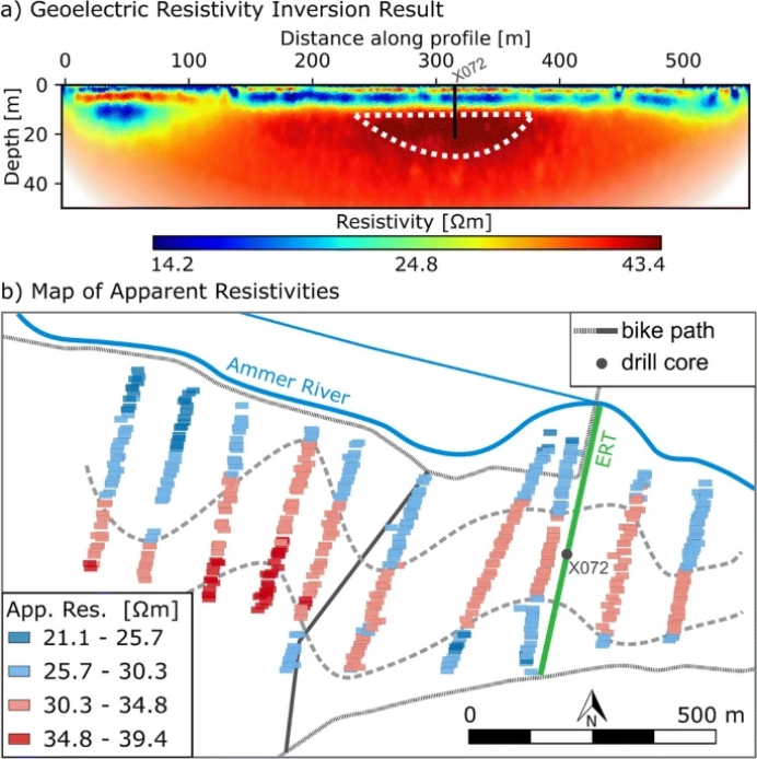 钻芯中的层接触在整个中央漫滩中是一致的,并且该漫滩岩性序列在图 3中有详细描述. 沿着山坡,基岩的总深度减少,在基岩接触面的顶部发现了红绿色的粘土砾石。由于钻取岩心既费钱又费时,地质解释得到了地电测量和井下自然伽马辐射测量的地球物理数据的支持。最后,所有数据都被合并到 Ammer 洪泛区的区域地质模型中。