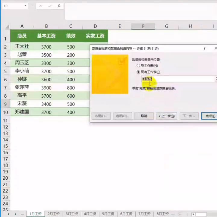 ·设置完成后,点击“下一步”,选择“新工作表”,完成。现在,数据透视表已经汇总好了。