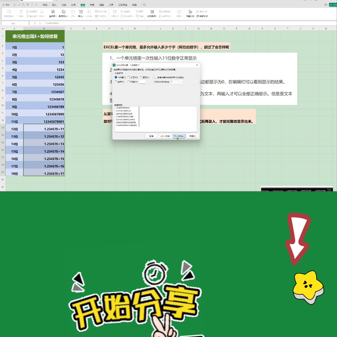 在第三步中,选择“文本”作为数据类型,然后点击“完成”。这样,E+就消失了,数据显示也正常了。