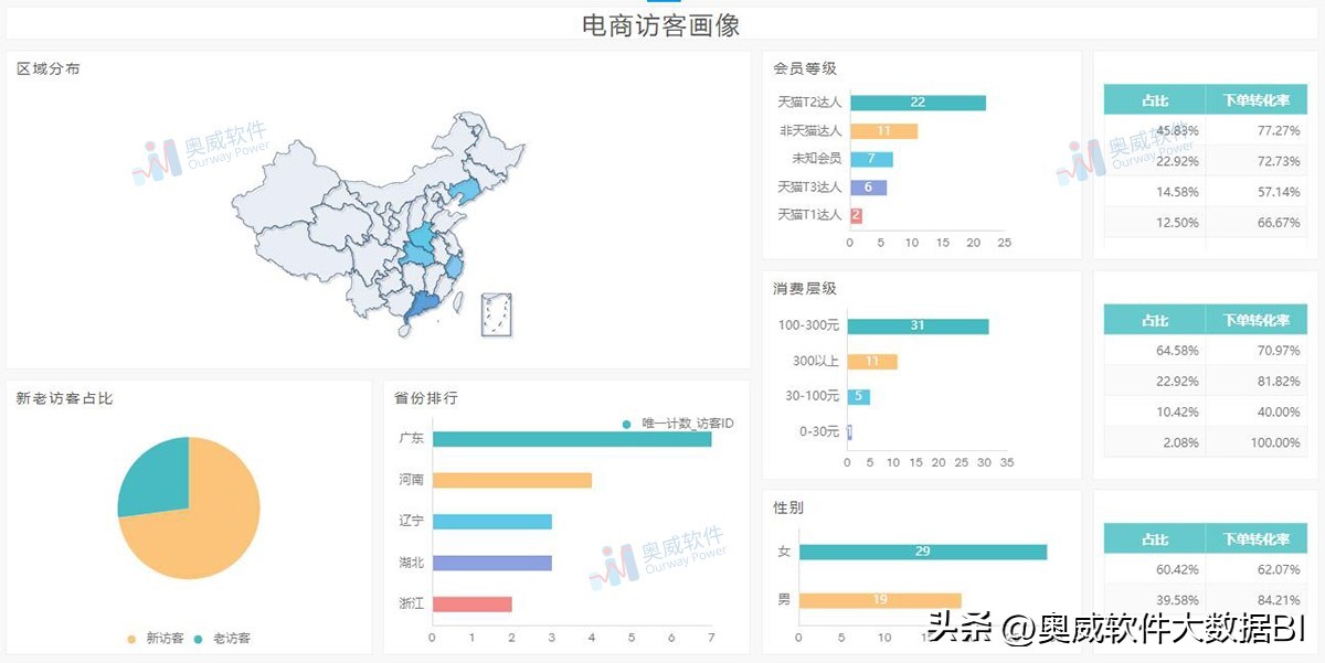这其实是一张分析对所售商品产生兴趣并点击访问的人群的报表,旨在帮助电商企业了解其网页的访客类型。该张BI电商访客画像报表主要分析了电商访客的区域分布、各会员等级占比以及下单转化率、各消费等级访客以及下单转化率、新老访客占比、访客省份排行、男女性别访客占比以及下单转化率。