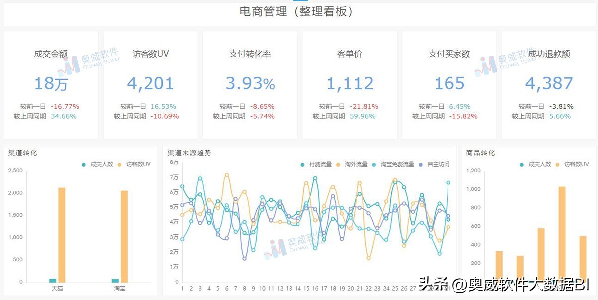 这类看板主要分析呈现了关键的电商数据分析指标以及情况,让决策层对电商运营效果有大致了解。比如上面这张BI电商管理看板截图就集中分析呈现了成交金额、访客数UV、支付转化率、客单价、支付买家数、成功退款额,并与前一日、上手同期数据进行了对比,是升是降一目了然。