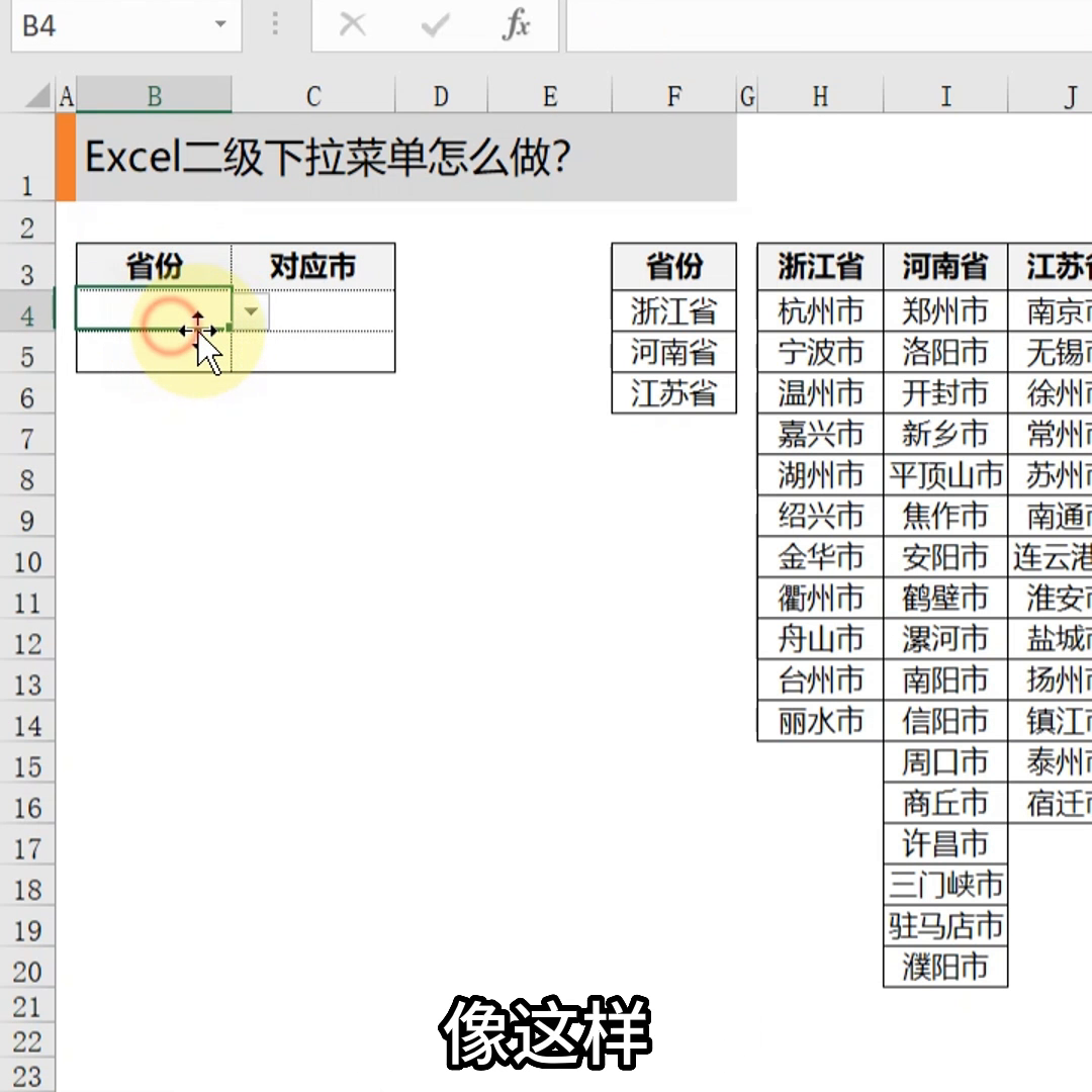 如何在Excel中制作二级下拉菜单?例如输入“浙江省”,即可自动显示其下属的“市”。对于“江苏省”也是如此。这种神奇的功能其实非常简单,如果不掌握方法,下次就不知道怎么做了。接下来,我们将为您演示如何操作。