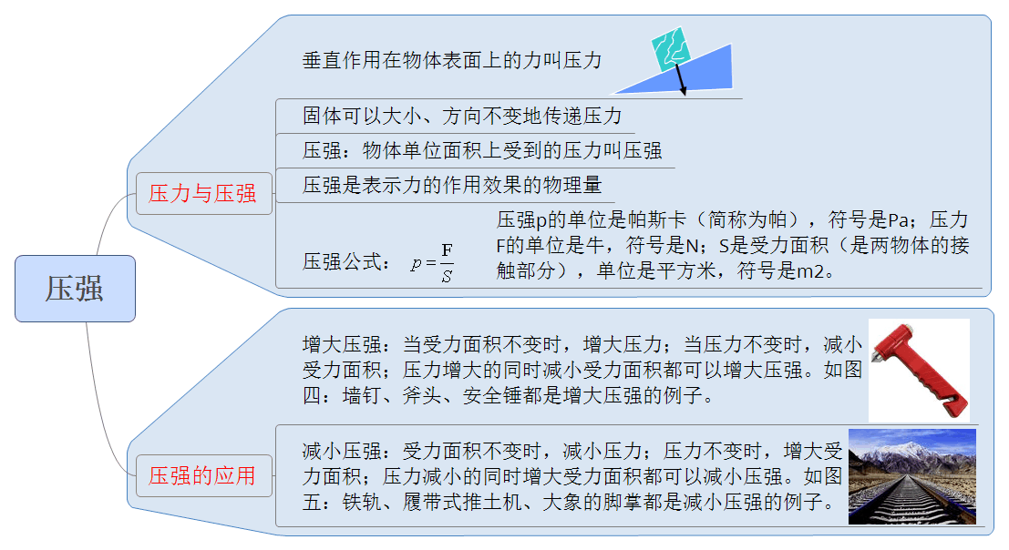 2.减小压强:受力面积不变时,减小压力;压力不变时,增大受力面积;压力减小的同时增大受力面积都可以减小压强。如图五:铁轨、履带式推土机、大象的脚掌都是减小压强的例子。