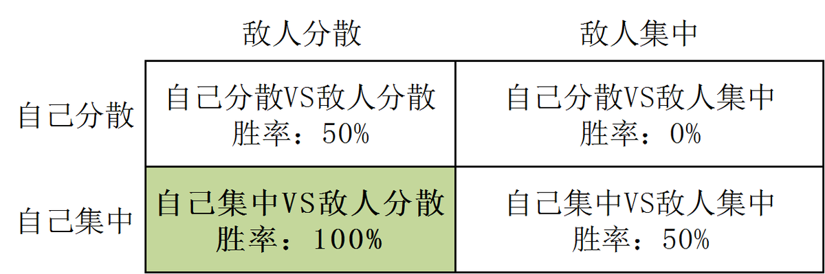 我们可以使用波士顿矩阵来分析集中兵力和分散兵力,自己分散、自己集中、敌人分散和敌人集中可以组合成四种情况:自己分散VS敌人分散,胜率50%;自己分散VS敌人集中,胜率0%;自己集中VS敌人分散,胜率100%;自己集中VS敌人集中,胜率50%(如表3-2所示)。