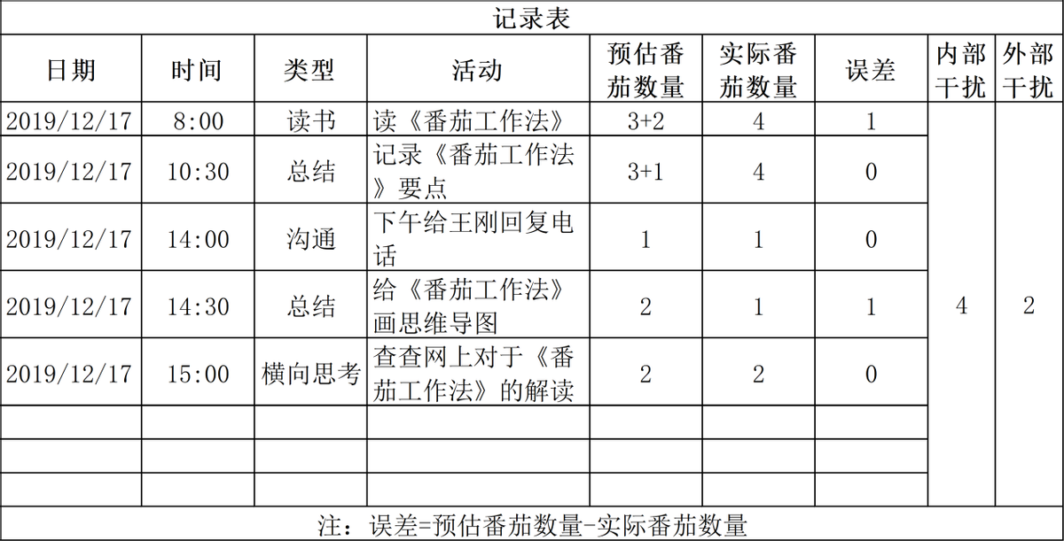 在记录表中,汇集了今天的各种工作记录数据,包括预估番茄数量、实际番茄数量和扰动数量等等。在预估数量一栏中,第一个数字表示第一次预估的番茄数量,第二个数字表示第二次预估番茄的数量,误差=预估番茄数量-实际番茄数量。我们希望自己能准确的预估自己每项工作所需的时间,所以应该尽可能的第一次就预估准确,而不需要进行第二次预估。刚开始使用番茄工作法时,预估可能会不准确,随着自己番茄工作法的熟练,预估会越来越准确。另外,为了使自己的效率增加,应该尽可能的减少干扰,比如提前把手机静音,防止外部电话干扰。