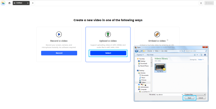 此方法可帮助您将本地视频直接上传到Gemoo库。Gemoo支持上传MP4,WEBM中的视频以及MP3,M4A,OGG中的音频文件。加载的视频将保存到 Gemoo 库。
