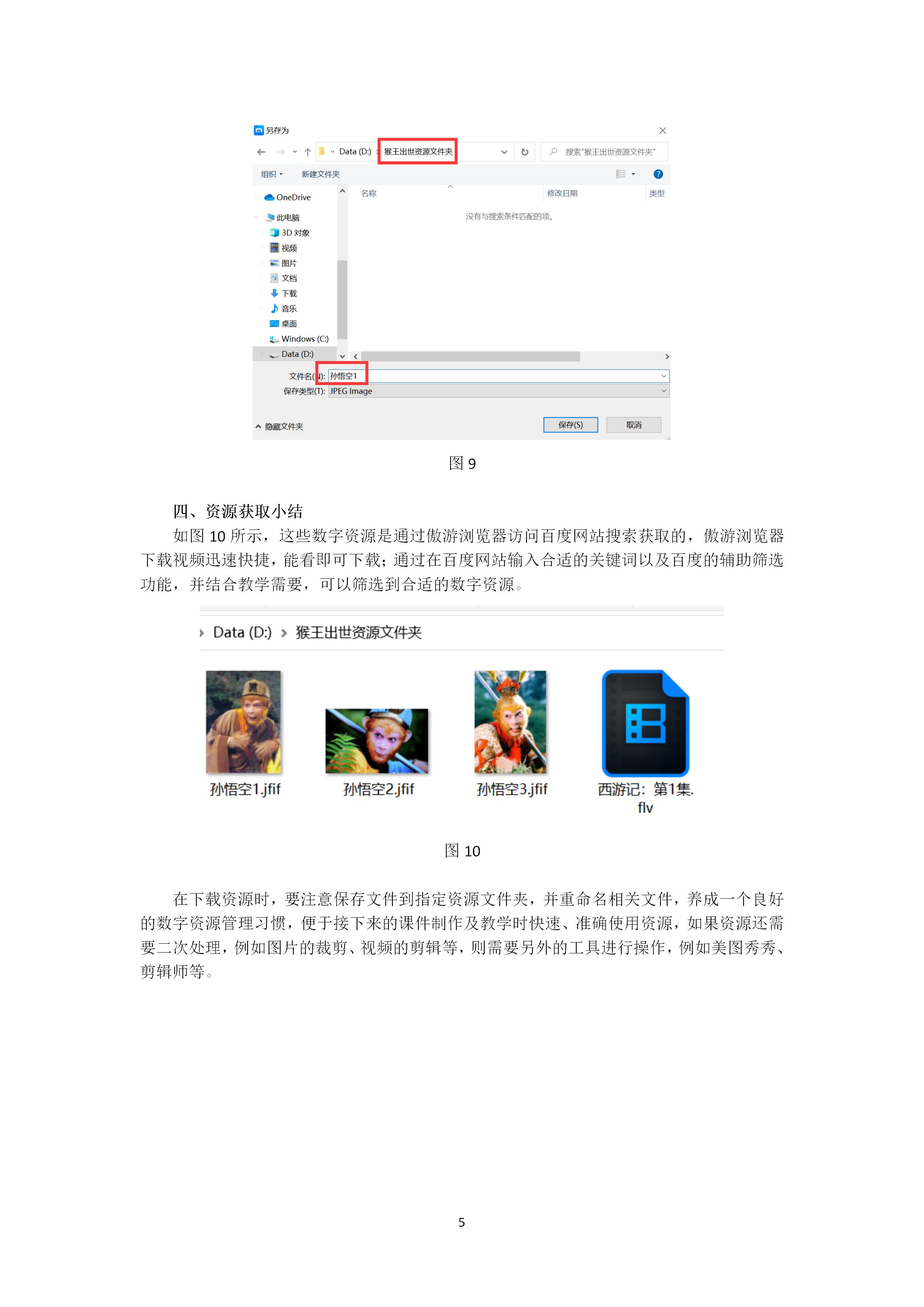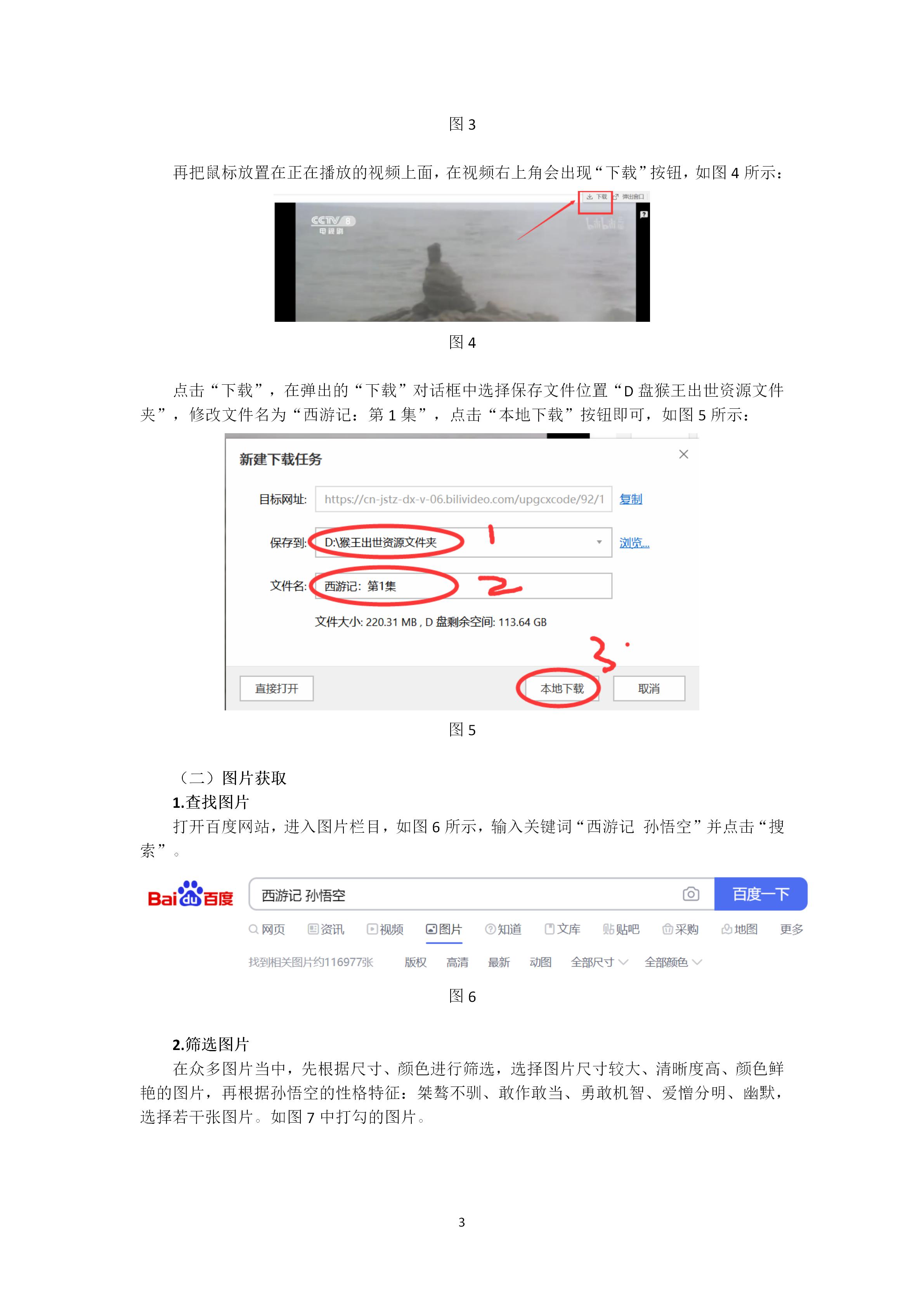 建议每个资源的获取从三个步骤来展示,一是资源的查找,这里就包括选择渠道和关键词的输入,例如是选择用搜索引擎百度来查找,还是直接到专业网站昵图网搜索,是输入“美猴王”,还是“孙悟空”关键词来搜索;二是资源的筛选,这是本视频的重点,也就是要通过操作画面和语音把“资源信息表”中的“科学性”表达出来;三是资源的下载,这里要展示的是下载的方法和资源的管理。例如图片下载就是直接按右键图片另存为,视频的下载可以用“傲游浏览器”直接下载,也可以用“360浏览器”录屏获取,论文可以到知网付费下载,也可以通过图书馆跳转知网免费下载,也可以到国家哲学社会科学文献中心免费下载。下载时请注意和A4数字教育资源管理结合,要把资源文件放到指定文件夹,要修改文件名为有意义的名称等。