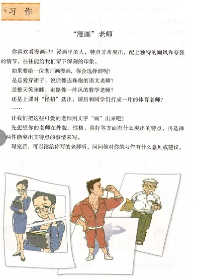 我们知道习作一般要解决两个问题,即写什么和怎么写。“漫画”老师是本次习作的话题,意思是用文字突出老师的特点。