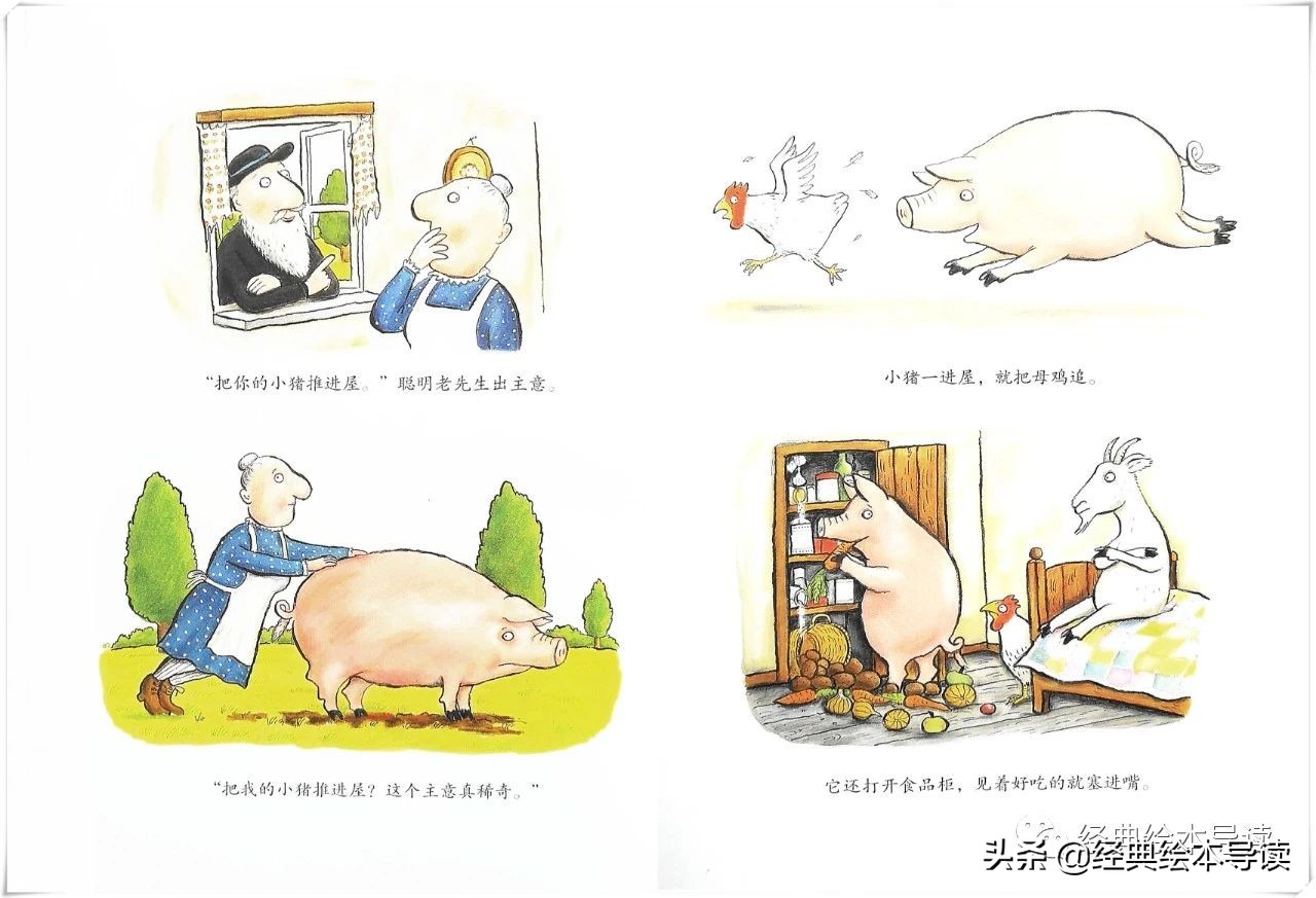 原文:“把你的小猪推进屋。”聪明老先生出主意。“把我的小猪推进屋?这个主意真稀奇。”小猪一进屋,就把母鸡追。它还打开食品柜,见着好吃的就塞进嘴。