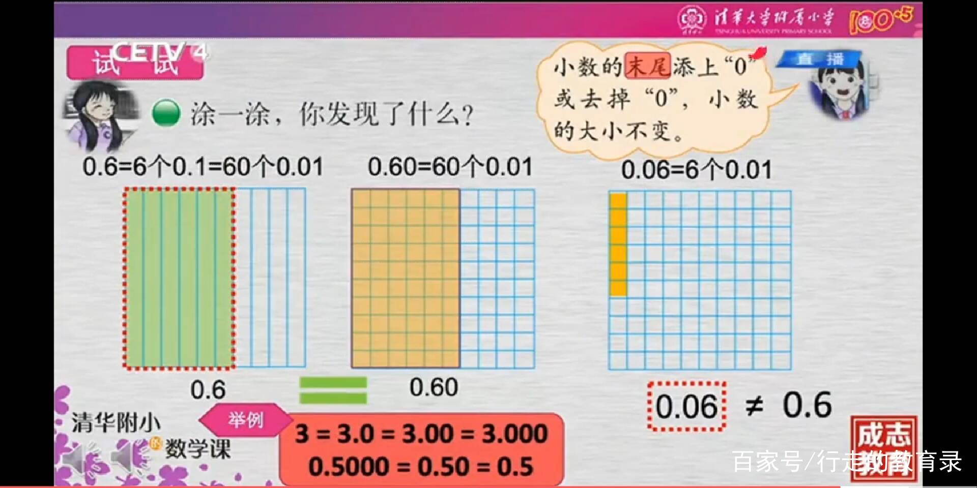 接下来我们学习了小数的性质,小数的末尾添上0或去掉0,小数的大小不变。在以后学习中应用很多。