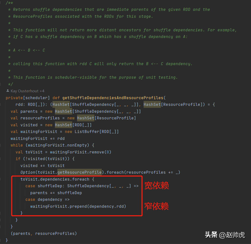 方法中,通过一个栈来记录分配到当前stage中的 RDD(窄依赖中的rdd都会被push到栈里),碰到宽依赖,则加到 shuffleDeps 中。