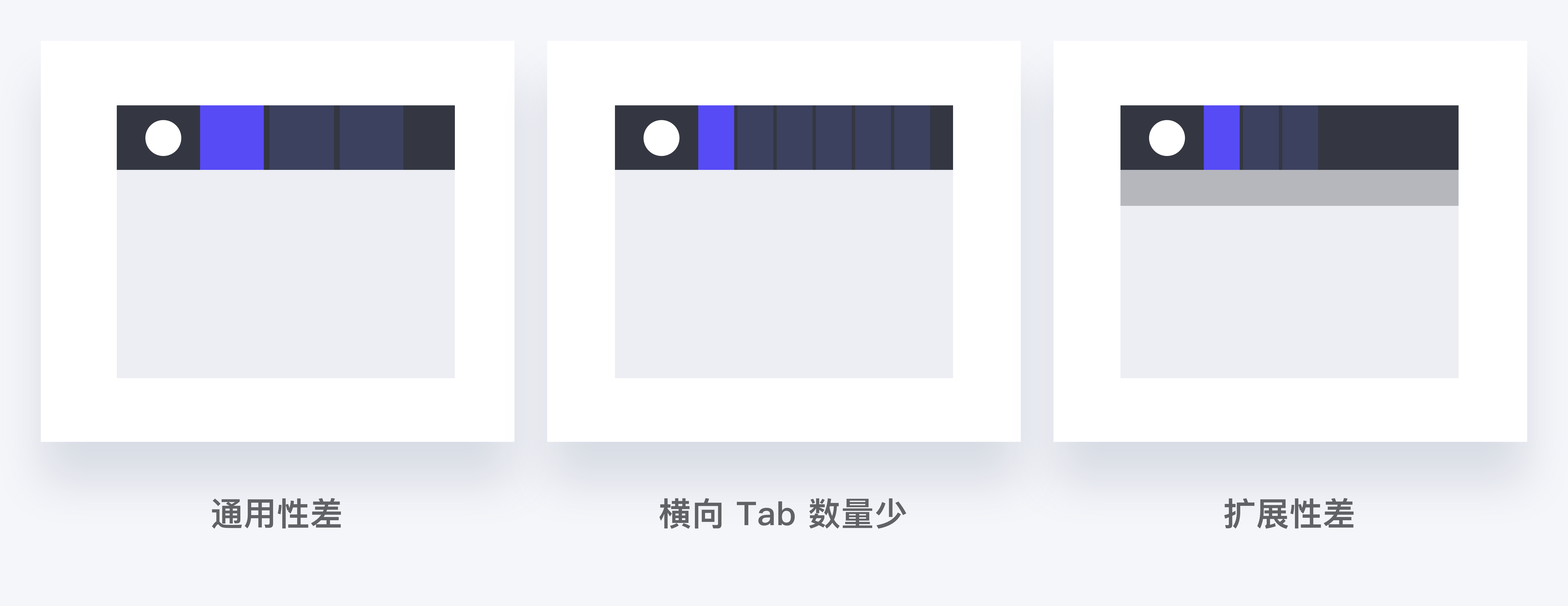 横向 Tab 数量少:承载不了太多菜单数量,超过 7 个后菜单排布会十分困难,横向空间利用率差