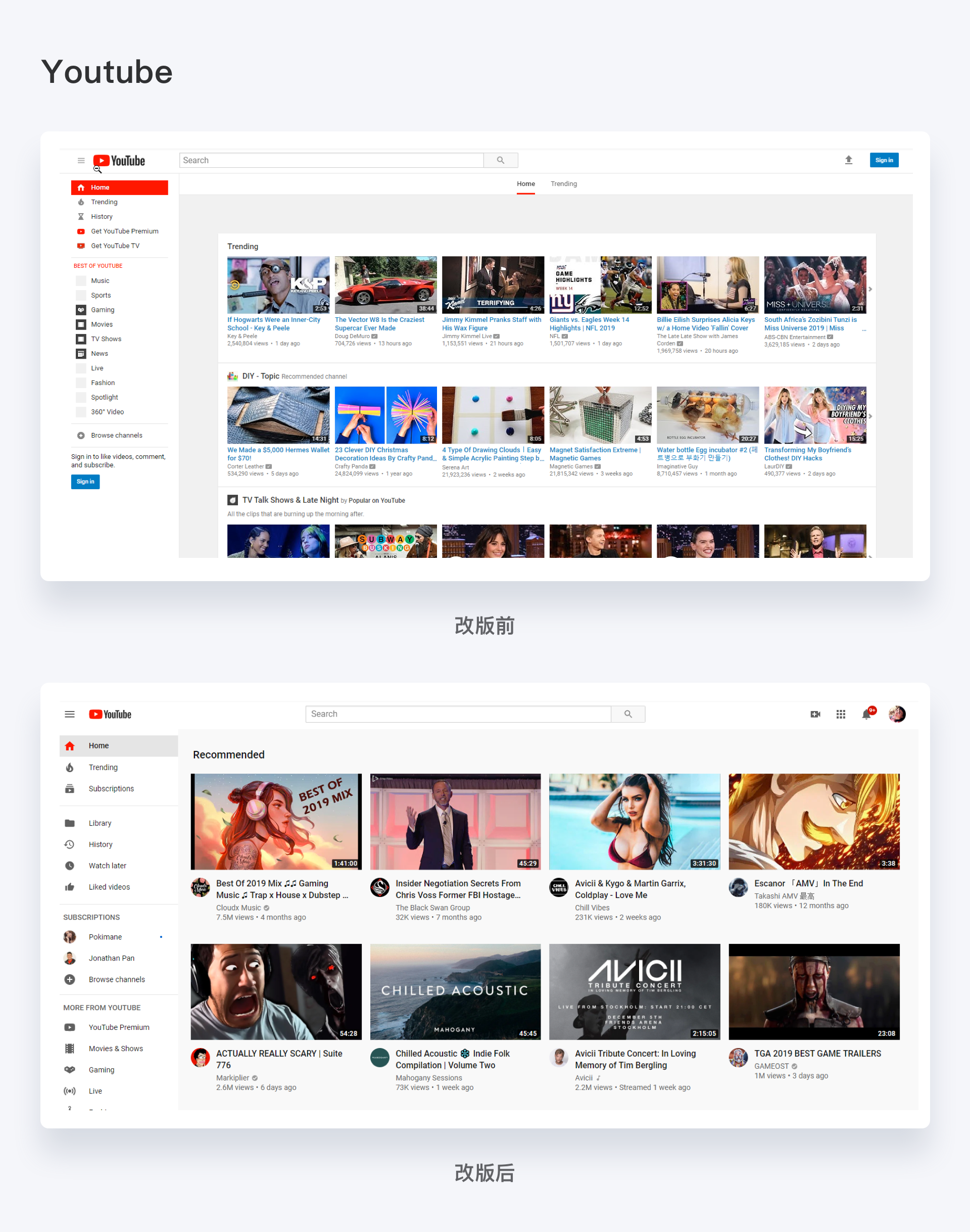 2019年也有类似的事情发生,有几个产品的WEB端进行了一系列的大改,YouTube、Twitch、Twitter都进行了重新设计,他们也不约而同的将块面去除,去掉多余的的灰色,通过留白和空间将页面拉开