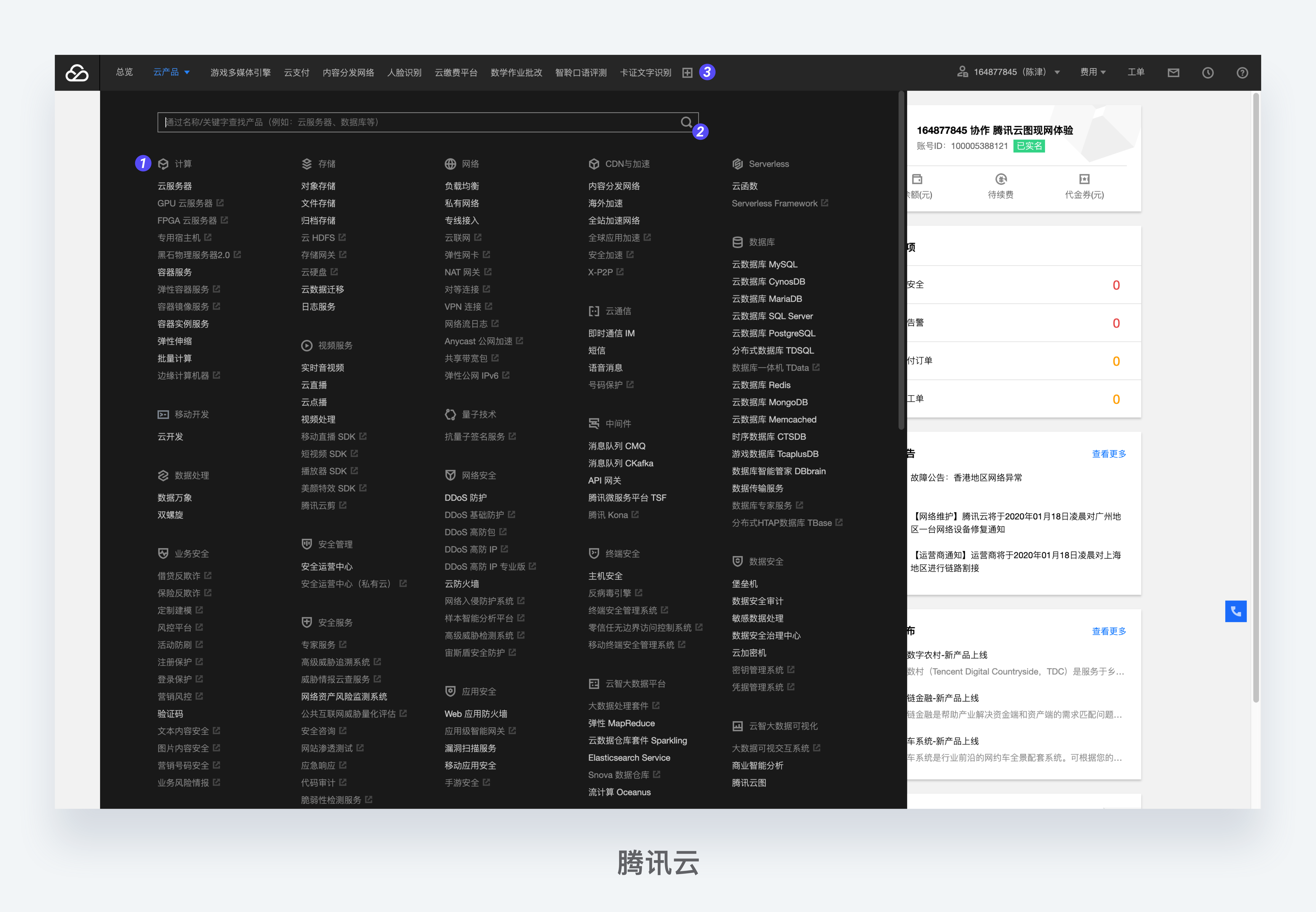 腾讯云目前拥有大概100+个云产品,他们都分布在导航菜单上,因此在导航设计上,它采取一种新的模式:1.全部菜单导航+2.搜索菜单+3.自定义导航