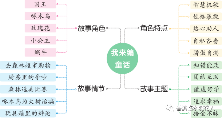 通过上面的思维导图,我们知道了编写一个好的童话故事,首先要选好故事角色,再设置好角色特点,接着写清楚究竟发生了什么故事,最后提炼出想要告诉大家的道理。下面我们一起看看这几位同学是如何构思的吧!