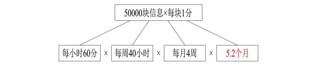 我们可以做一个简单的计算:50000块信息×每块1分÷每小时60分÷每周40小时÷每月4周≈5.2月,这里的结果是5.2月,是按照每个信息需要1分钟进行计算的(如图2-4所示)。