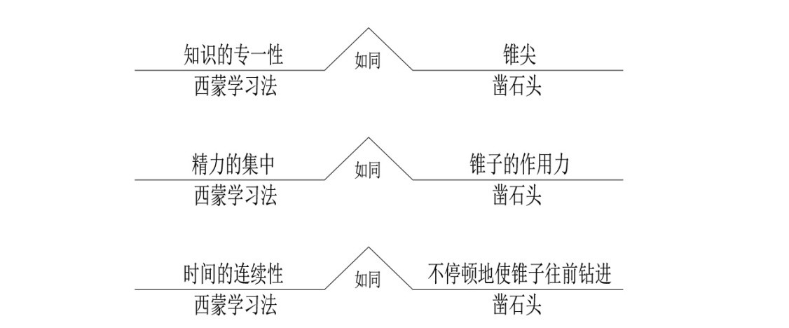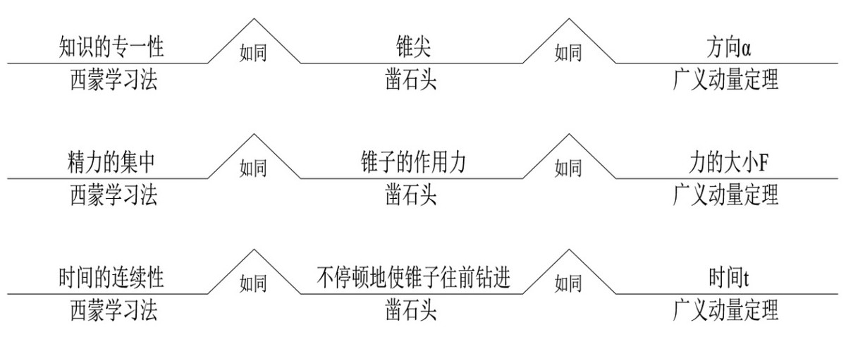 我们也可以将西蒙学习法、凿石头和广义动量定理放在一起进行类比,西蒙学习法的知识专一性就如同凿石头的锥尖,也如同广义动量定理中的方向;西蒙学习法的精力的集中就如同凿石头的锥子作用力,也如同广义动量定理中力的大小;西蒙学习法的时间连续性就如同凿石头的不停顿地使锥子往前钻进,也如同广义动量定理中的时间(如图2-11所示)。