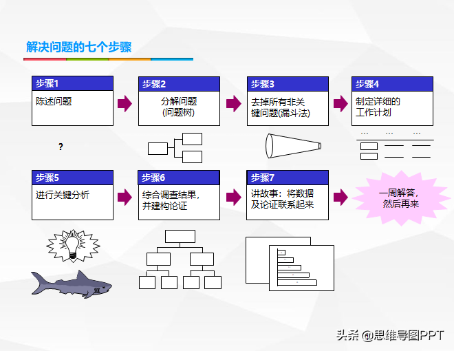 咨询公司最大的竞争力就是方法论,这些方法论是无数顾问的知识沉淀,只要通过考核正式入职,公司就会有一系列的培训,基础版的有职业素养、商务礼仪,专业版的有结构化思维、商业PPT、沟通技巧等方面的方法论,今天就分享麦肯锡团队训练中的一部分:解决问题的7个步骤,文末有小福利 ^_^