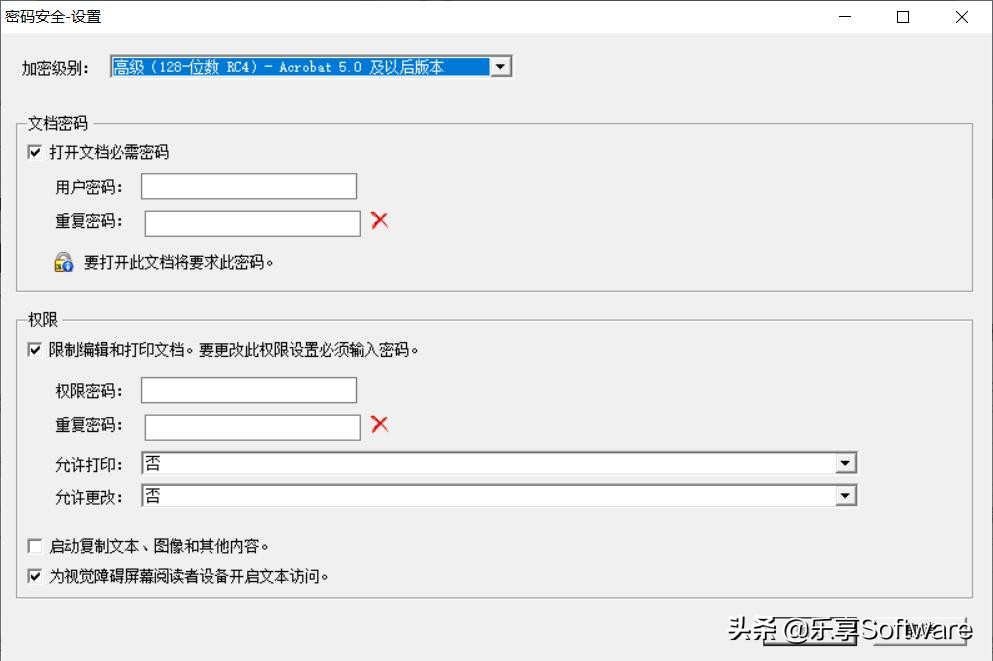如下图,加密级别选择任意一个都可以,小编选择的是"高级(128位数 RC4)-Acrobat5.0及以后版本"这个加密级别。如果你想为文档设置密码,就把"打开文档必需密码"这个选项打上对勾。