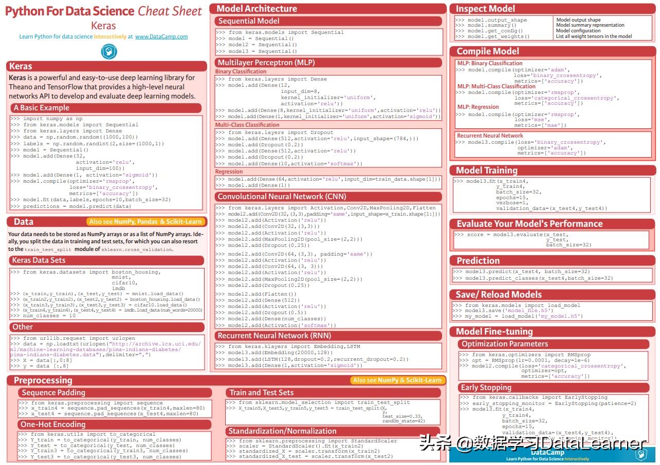 DataCamp是一个数据科学领域的教育企业,提供R语言、Python等与数据科学、机器学习相关的课程。日前,DataCamp发布了一个Keras备忘单,这个备忘单只有一页,但是却记录了Keras相关使用技巧的样例代码。
