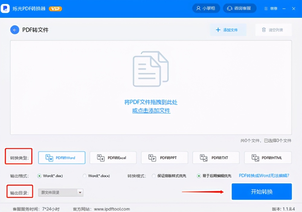 7.2、进入【PDF转文件】功能页面后,点击右上角的【添加文件】或者拖拽PDF文件到中间的转换框里