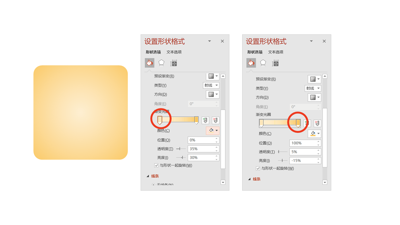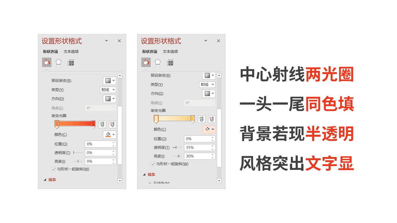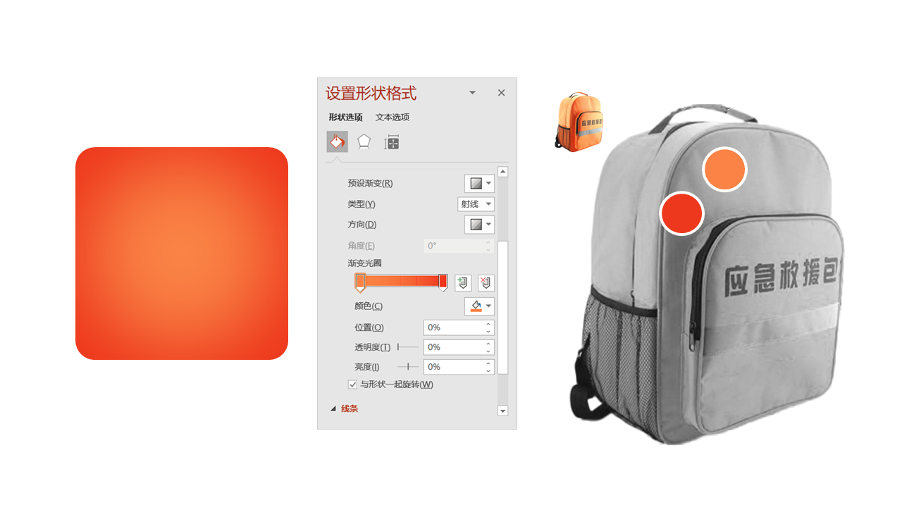 使用的颜色的来源是应急救援包这个素材图上取到的,在新版PPT中我们可以用取色器直接在上面吸取颜色。说到这里,我额外给大家一个使用建议:选择同一色调的颜色来做渐变更容易容易上手和操控。渐变效果,则是做了一个射线渐变,方向设置是从中心,光圈设置为一头一尾两个光圈。完成这些设置,就可以得到左侧所示的渐变效果了。