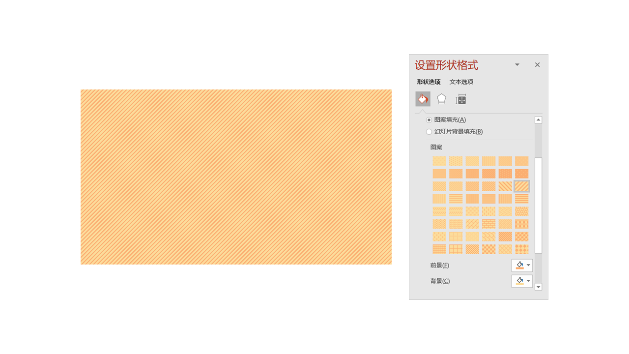 在设置形状格式里面,我们找到填充-图案填充,通过前景色和背景色的一深一浅就可以得到这种倾斜的纹理。