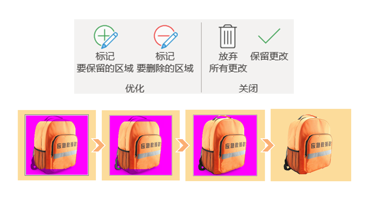 然后就可以看到,工具栏会多出现如图所示的几个选项。我们在进入这个状态以后,可以通过标记保留笔来标记需要保留的区域。用涂抹的方式简单的勾勒一些线条,就可以把我们要保留的区域勾勒出来。同样的办法也可以把要删除的区域勾勒出来。勾勒完毕以后,电脑会自动处理,最终得到底下的这个流程步骤第3张图的状态。即,我们主要要保留的区域,都显现原色;其他区域,都被紫色填充。此时,我们点击一下保留更改,这个图就抠出来了。