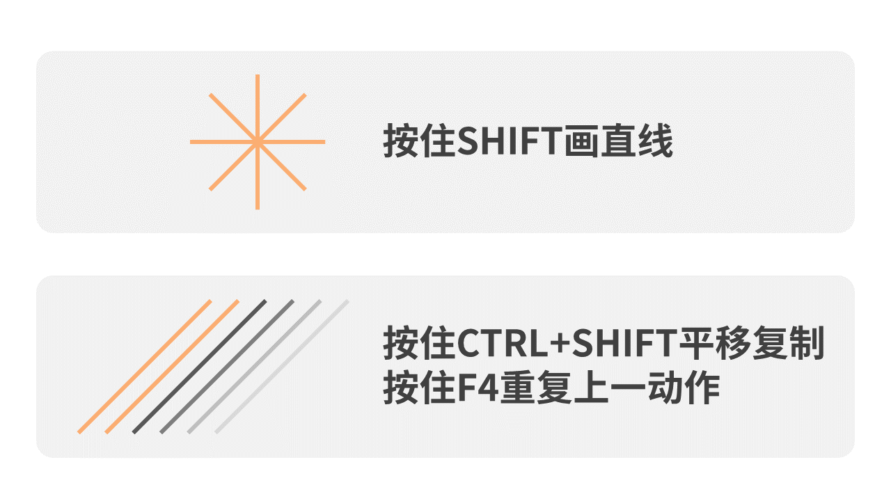 第一种,按住shift直接画直线。在PPT中,当我们按住shift去画直线时,可以绘制出这种米字形的4个方向的直线,它们相互之间夹45°角。手绘法纹理需要的就是这种45°角的线。当我们绘制出一条线后,就可以按住ctrl加shift键,鼠标平移拖动,复制出新的一条线,然后不停的按F4就会复制出许多线条,且相互之间间距相等。快捷键F4的作用是重现上一步操作,此处重现的就是平移复制线条。示例图上看到的后面几条逐渐变得比较淡的,灰色的线就是按住F4复制出来的。此处颜色的改变是我手工上色的结果,方便讲解。