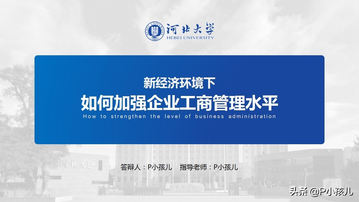 如果觉得背景过于简单,可以把学校的照片叠在底部,加上一个半透明的色块遮罩一下,作为PPT封面页的背景。