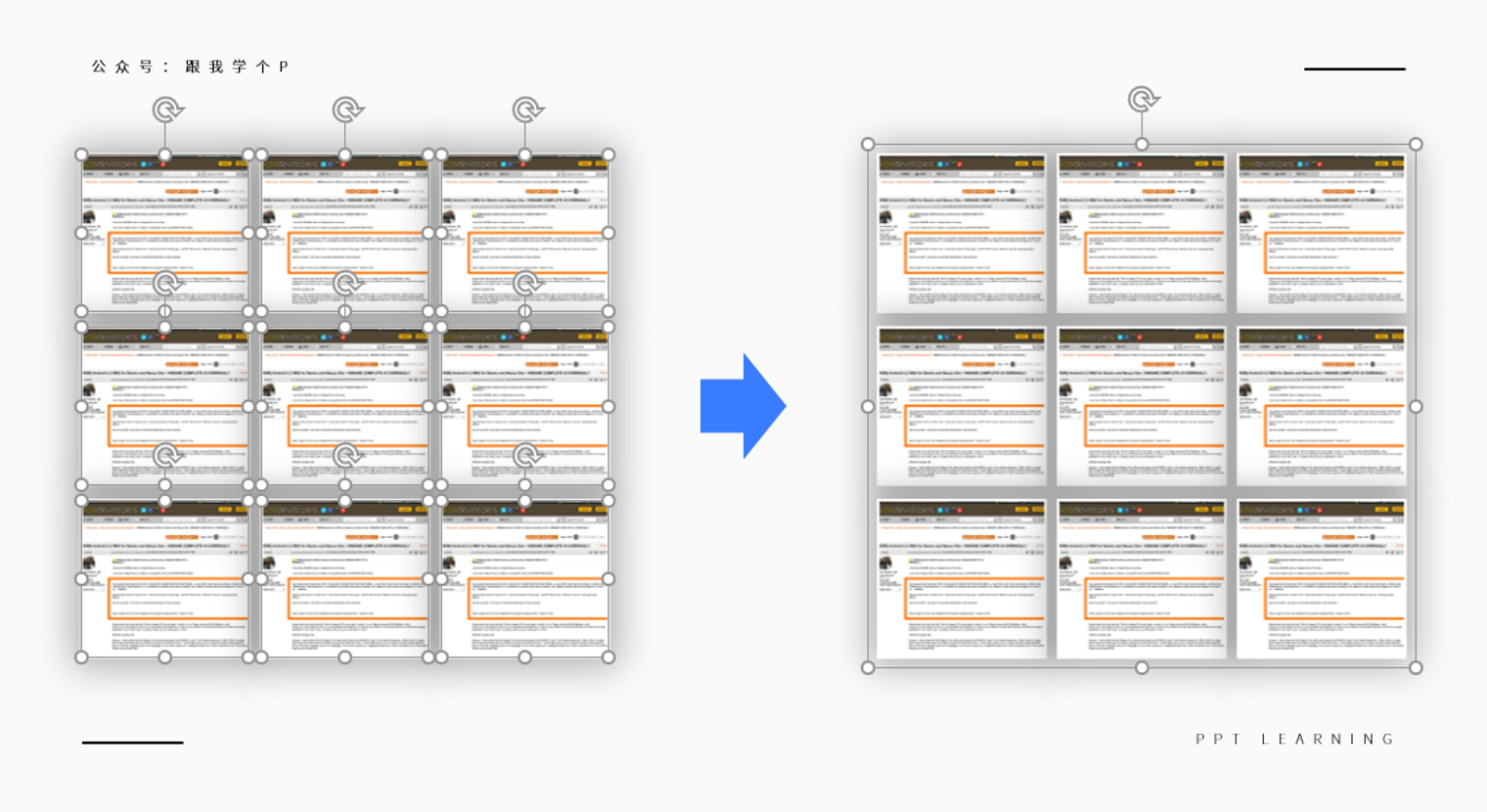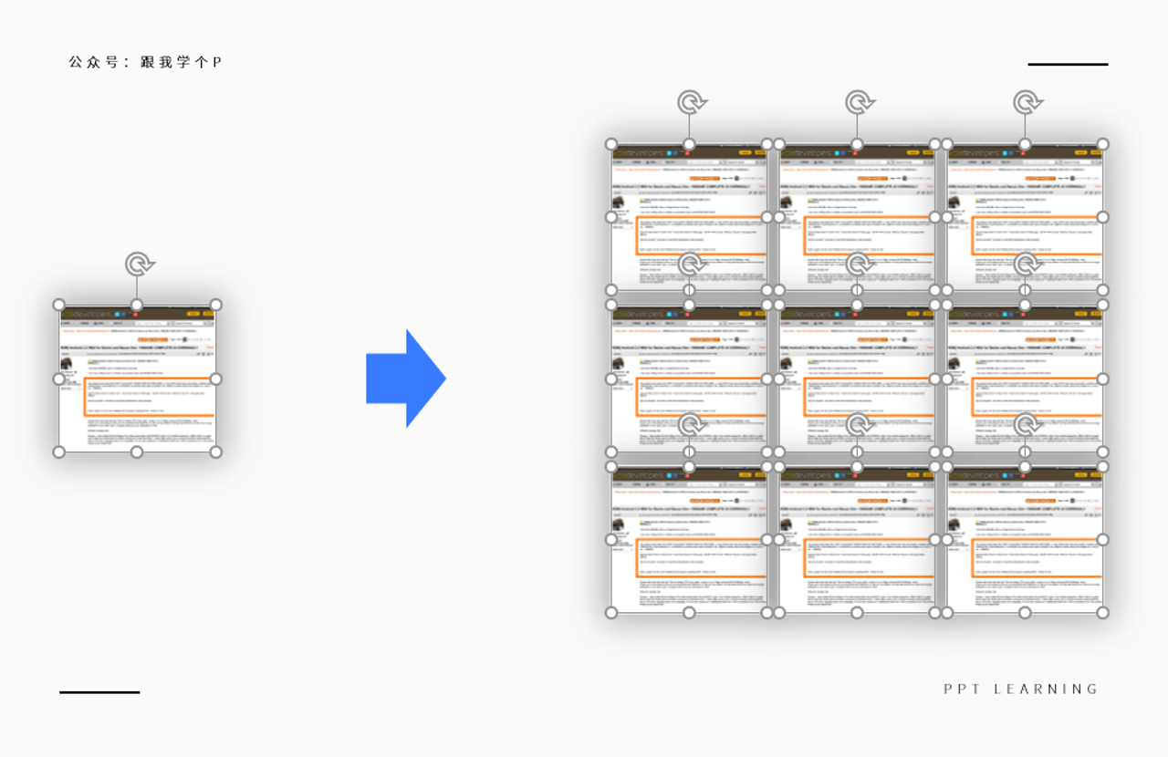 把截图复制多几份出来,再利用【对齐工具】里的【顶端对齐】以及【纵/横向分布】功能,你就能将它们排版成矩阵的样子: