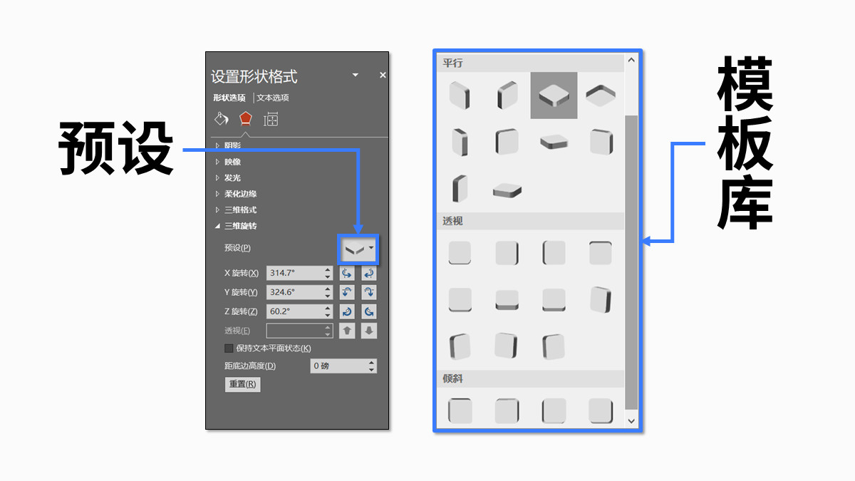 如果你不想自己一点点调试【X/Y/Z/透视】这四个参数的话,你也可以直接在【预设】里选一种系统已经为你调配好了的模板: