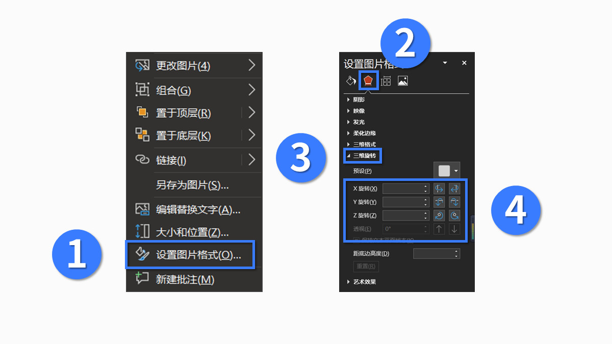 右击图片,点击【设置图片格式】-【效果】-【三维旋转】-接着瞎鸡儿设置一下旋转的参数即可: