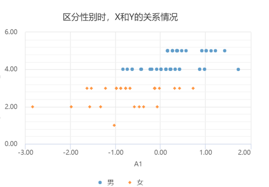 上图为区分不同性别群体时,X和Y的散点图。用户在SPSSAU中需要让性别放入“颜色区分项”框即可,可直观展示不同类别时,数据间的关系差异情况。